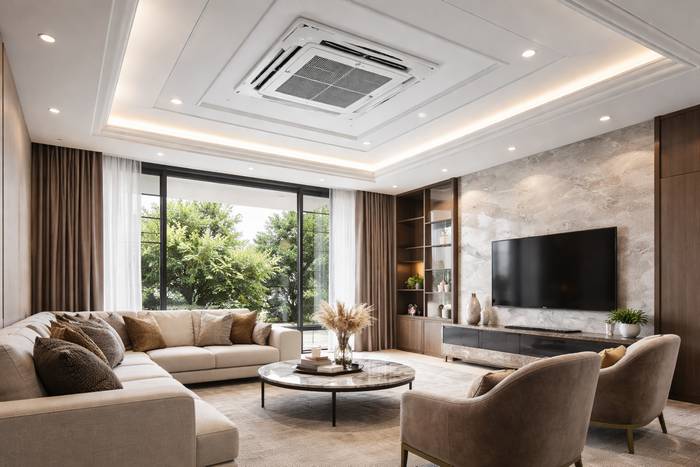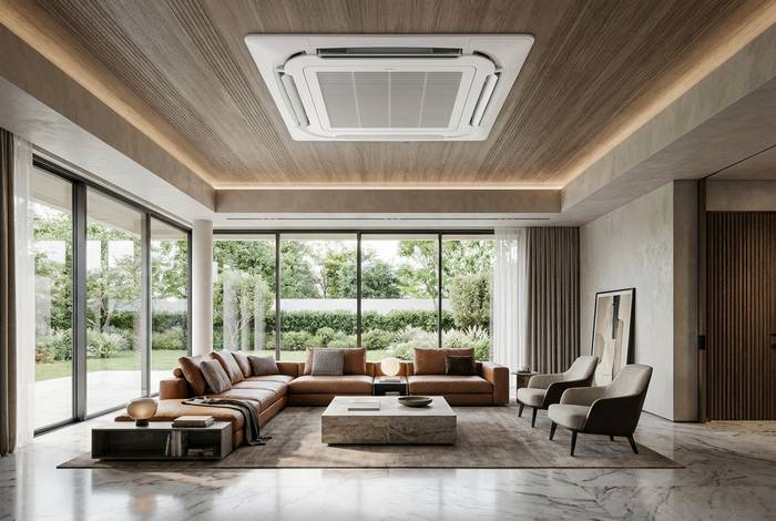 Dans le secteur résidentiel, les climatiseurs cassettes conviennent aux maisons contemporaines dotées de grands espaces de vie ouverts. Les séjours de plus de 50 mètres carrés avec des hauteurs sous plafond généreuses tirent parti de cette technologie.