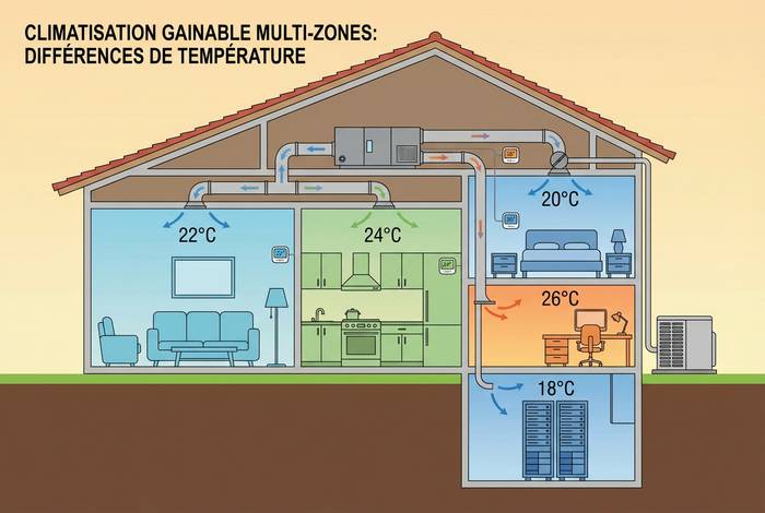 La climatisation gainable multi zones fonctionne selon un principe de distribution intelligente de l'air traité. Le système comprend une unité extérieure reliée à une seule unité intérieure, généralement installée dans les combles ou un faux plafond. Cette unité intérieure distribue ensuite l'air climatisé via un réseau de gaines dissimulées vers chaque pièce équipée.